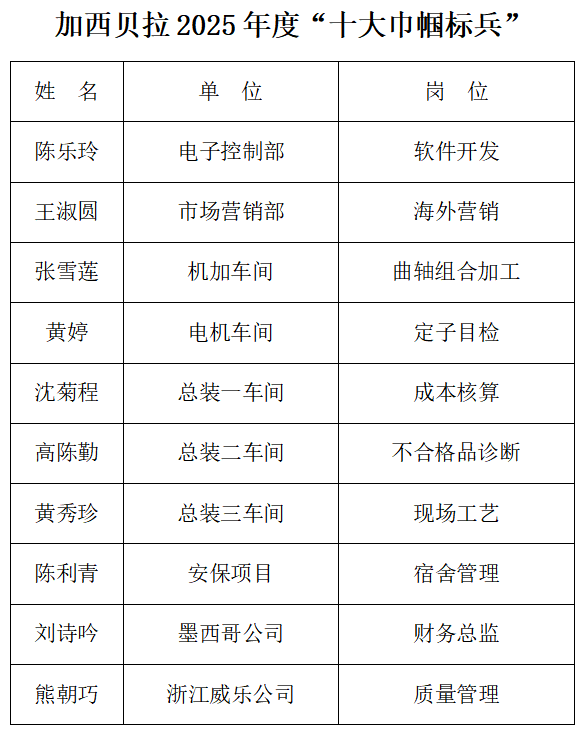 為表彰先進(jìn)、樹立典型,在各黨支部的領(lǐng)導(dǎo)和各單位行政的支持下,各分工會對2025年度公司“十大巾幗標(biāo)兵”組織民主推薦,經(jīng)公司女職委初審,公司工會委員會審批,并報請公司黨委同意,評選出加西貝拉2025年度“十大巾幗標(biāo)兵”。公司黨政班子成員徐耀法、謝建峰、王悅和各工廠廠長、女工委負(fù)責(zé)人,到“她”的工作崗位,為“十大巾幗標(biāo)兵”頒獎。